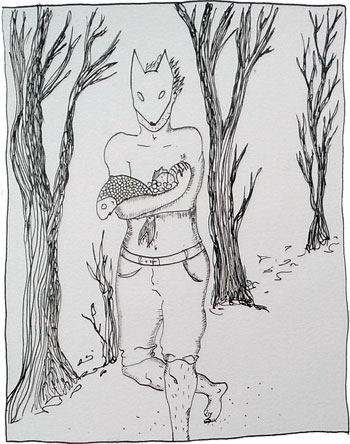 L’homme au masque de renard revient, les bras chargés de victuailles. Il est assez fier de lui, il espère émerveiller la jeune femme. Lorsqu’il s’aperçoit qu’elle est partie, il s’assied lourdement sur le bord du lit, prend sa tête entre ses mains et se lamente pour le plaisir. Il n’a aucun doute sur l’avenir, il goûte avec délice cet instant de chagrin.