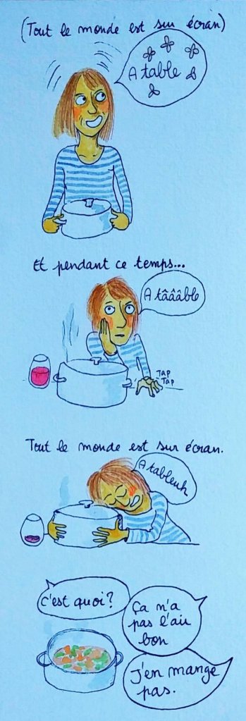Dans ma quête de la vie parfaite (chapite 12 de mon Guide pour être moi, qui ne paraîtra jamais, soyez rassurés) il est question d’exclure de mon alimentation les produits industriels. Pourquoi ? Parce que c’est mal. Au début du confinement, j’ai fabriqué des pâtes. C’était ma phase passionaria de la bouffe, des heures en cuisine, les mains dans la farine… Plus tard, j’ai préféré dessiner.