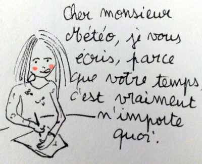 Attention si vous portez des sandales, aujourd’hui il pleut. Vous risquez d’attraper froid, ça nous changera du virus. Dans les années soixante-dix, on s’enrhumait par les pieds, dans les années quatre-vingt par la tête, dans les quatre-vingt-dix par le ventre, les deux-mille par le cou, deux-mille-dix par le dos. En 2020, le rhume n’existe plus. On peut tenter la sandale avec une météo incertaine. Joie.